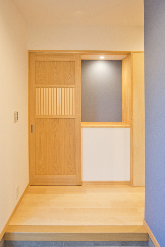 中央に格子と磨りガラスを施し、隣室に照明がつくと趣を変えます。