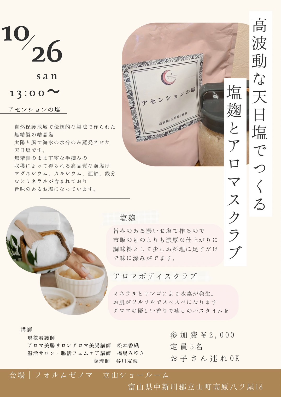 内 容 : 高波動な天日塩でつくる塩麹とアロマスクラブ ♪