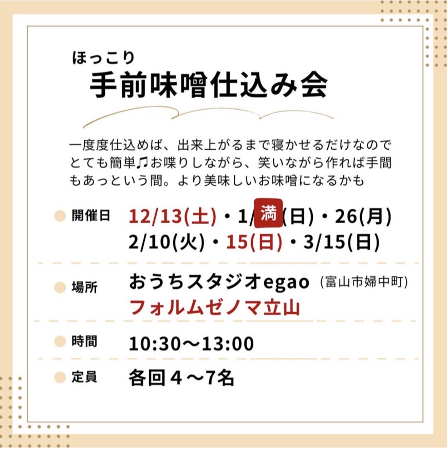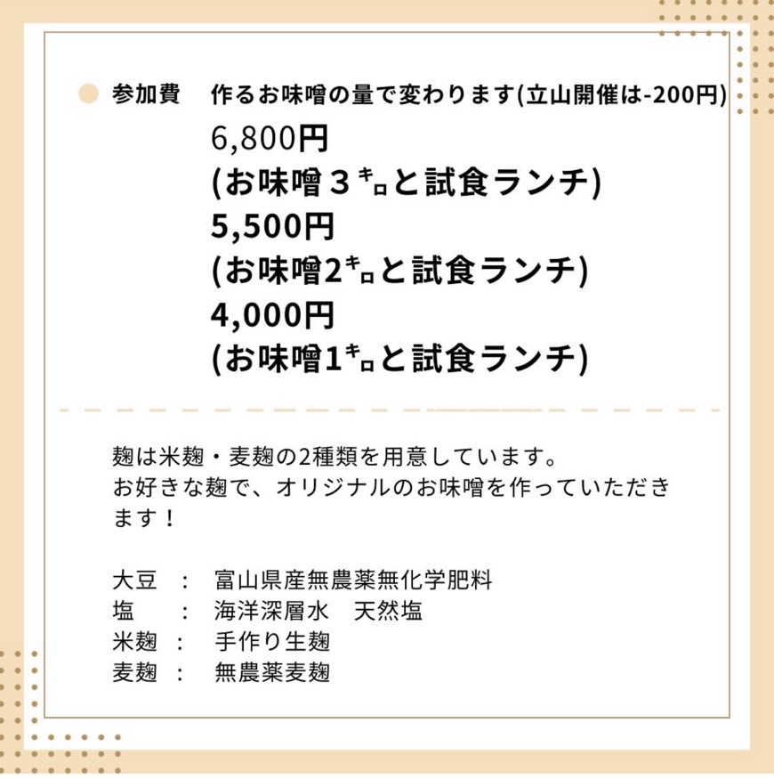 参加費:作るお味噌の量で変わります