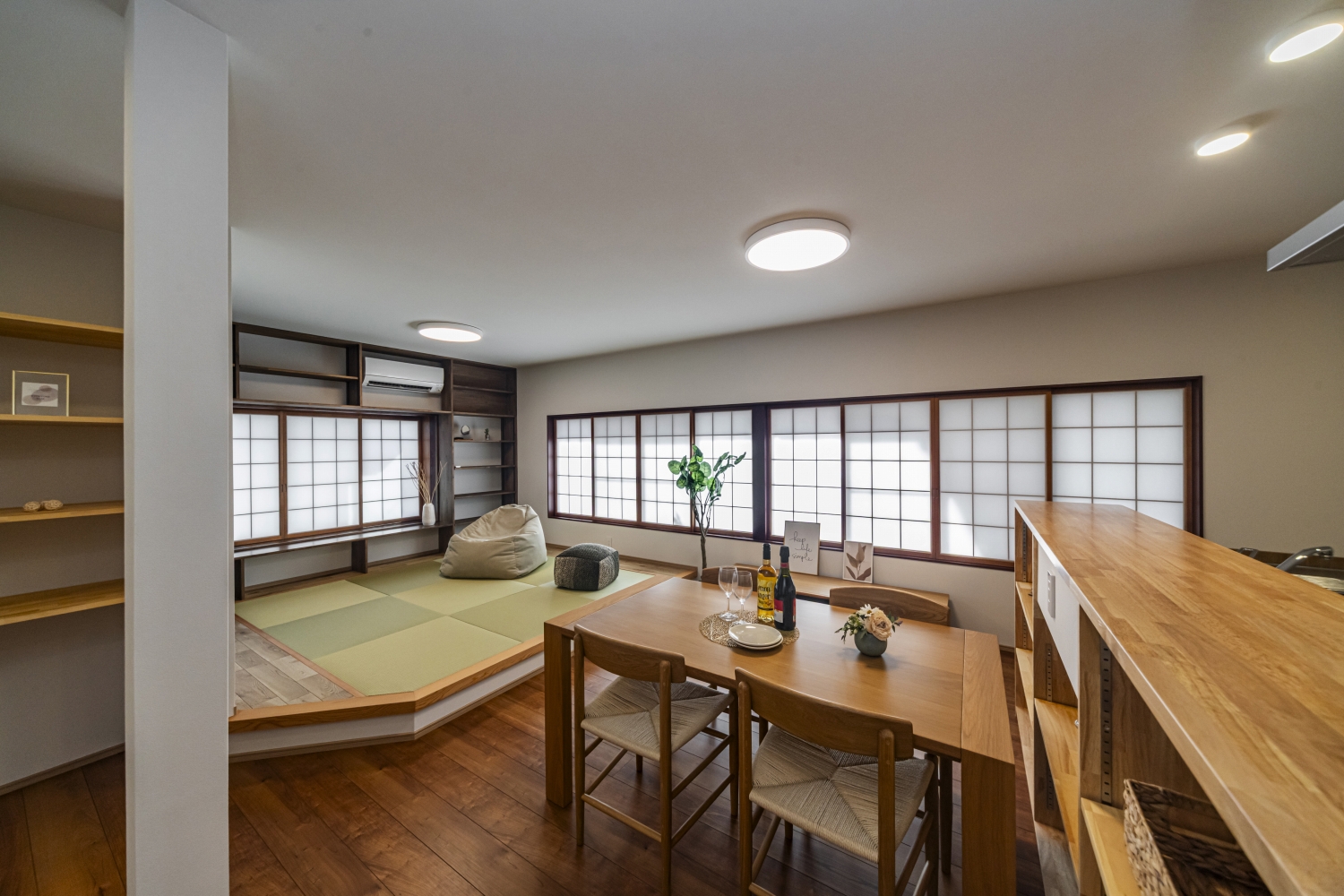 もともとあった障子窓と和室だった部屋の雰囲気を残しつつも、明るい白の壁面と天井のモダンで落ち着いたリビング・ダイニング空間に大変身しました。新たに設けた小上がりには畳を敷きつつサイドに書斎スペースを設け、コの字型に囲うことで適度にプライバシーを保ちつつ家族の気配を感じる、仕事にも読書にもぴったりの空間となりました。